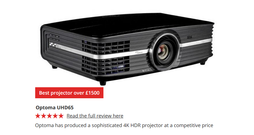 ...ove godine, u žestokoj konkurenciji proizvođača video projektora, Optoma je uvjerljivo odnjela dvije pobjede i to model UHD40 za najbolji projektor ispod £1500, te model UHD65 za najbolji projektor iznad £1500.