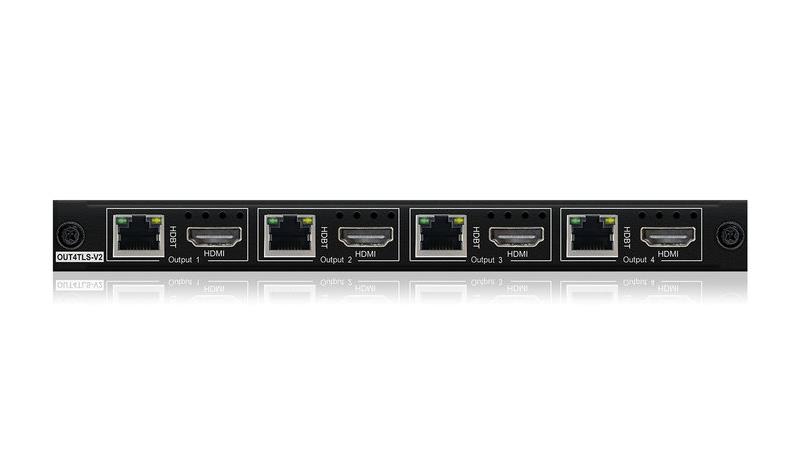 Izlazna ploča PRO-OUT4TLS-V2 nudi 4 x dvostruka HDBaseT ™ izlaza za spajanje na HDBaseT ™ prijamnik i HDMI zaslon po zoni. Koristi CSC tehnologiju koja omogućava podršku HDMI 2.0 4K 60Hz 4: 4: 4 (18Gbps) HDCP 2.2 distribucije signala do duljine od 40m (1080p do 70m). Sadrži neovisno smanjivanje 4K video ulaza na izlazima CSC HDBaseT ™ kako bi zasloni koji podržavaju samo niže razlučivosti videa mogli primati 4K video, dok na ekranima veće rezolucije i dalje prikazuju maksimalnu izvornu 4K UHD rezoluciju. Sadrži i priključke modula za brzo otpuštanje koji omogućuju jednostavnu instalaciju u prilagođeno središte Pro Matrix.