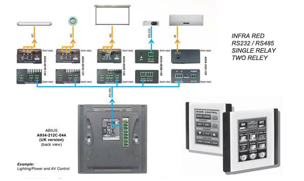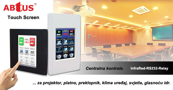 Touch-Screen programabilni kontrolni zaslon sa 3, 6, 8 ili 12 tipki i memorijom za 32 koda, 1xRS232 ulaz, 1x RS232/RS485 ulaz/izlaz. Samostalno može kontrolirati jedan RS232 uređaj. Proširivo sa dodatnim modulima (IR, relay, RS232). Jednostavna i praktična kontrola opreme. Zaslon sa kontrolnim tipkama je moguće dizajnirati prema potrebama i željama korisnika. Zaslon se ispisuje na poluprozirnoj foliji koju obasjava pozadinsko svjetlo.