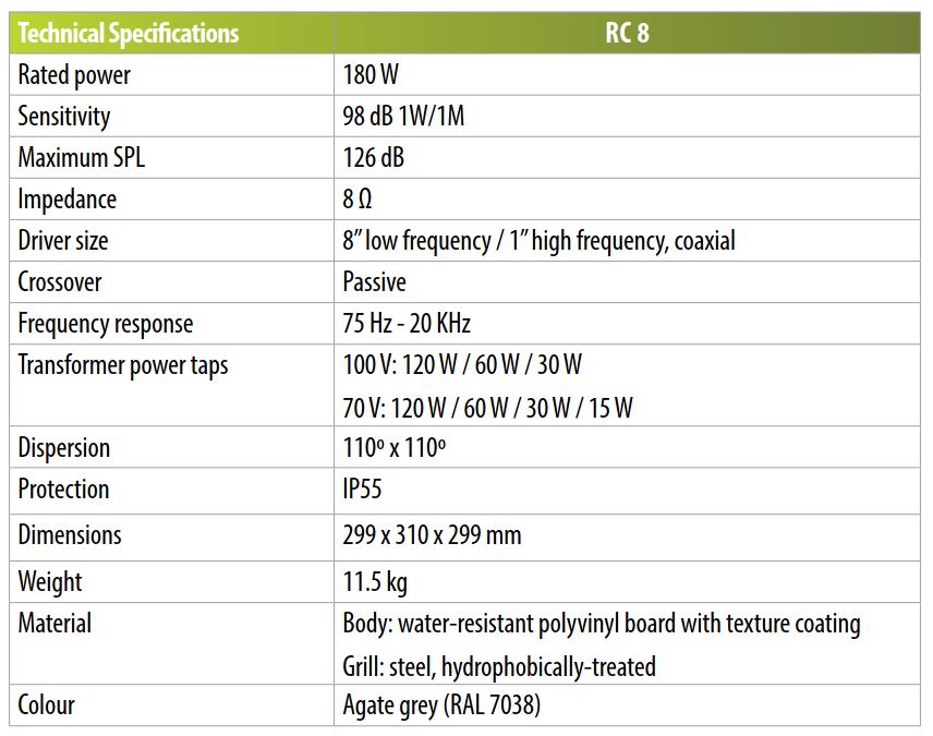 AMC RC 8 može proizvesti visok zvučni tlak (126 dB) s opremljenim 8”/1” konusnim zvučnikom visoke osjetljivosti (98 dB @ 1W/1M), širokim kutom disperzije i vodoravno i okomito (110º x 110º), unutarnjim 70V / 100V transformator i pasivna skretnica.