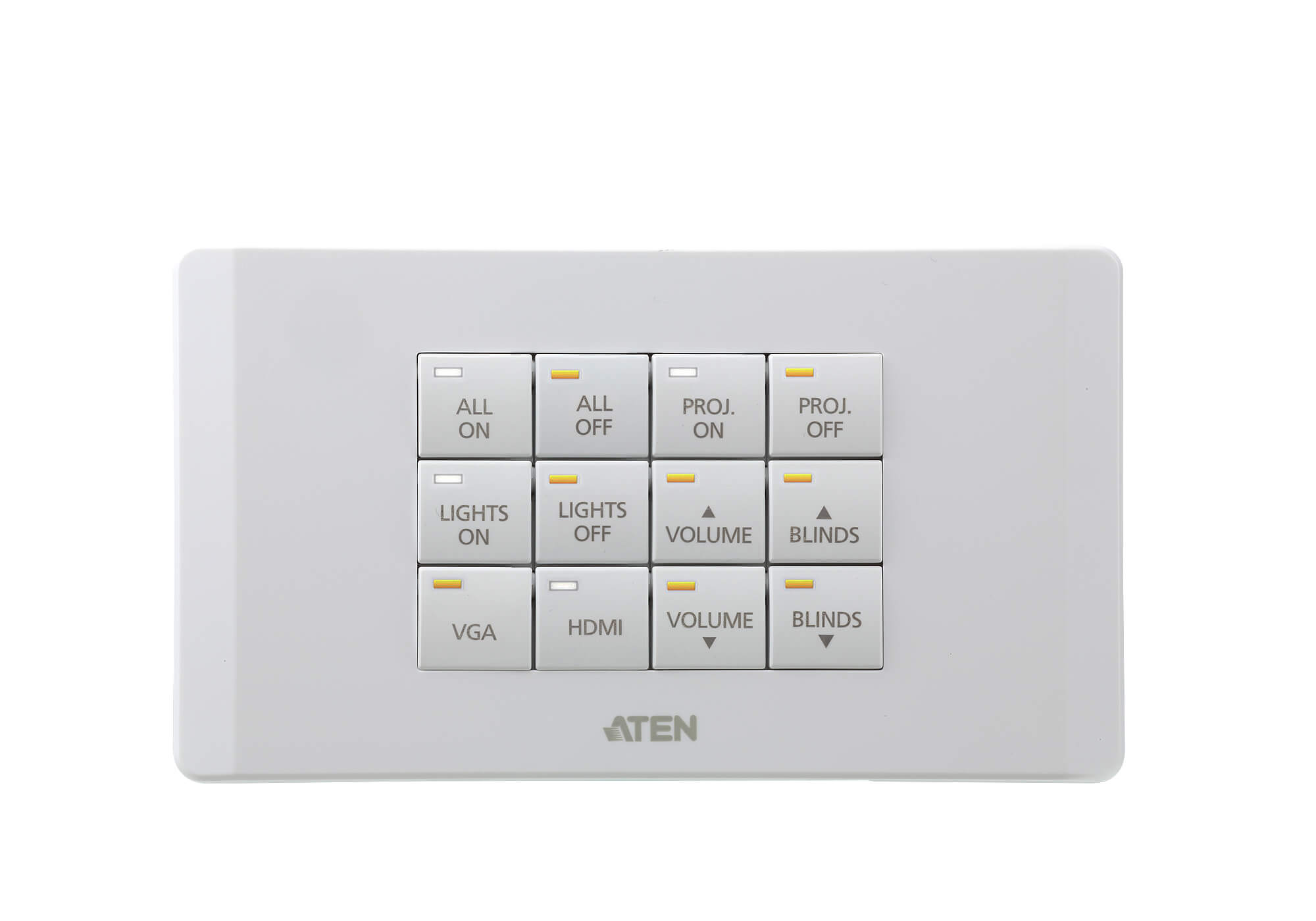 VK112EU is a fully-customizable 12-button keypad designed for use with the ATEN Control System. The keypad provides an interface to control devices in a room from a standard wall mounted faceplate. Created with flexibility in mind, the 2-gang keypad can be laid out in 125 different combinations of 6 to 12 buttons that snap together as easy as Lego’s. By connecting to the VK2100/VK1100 Control Box over a LAN, users will find it’s effortless using VK6000 software to configure the desired control of any connected device from the keypad. With the buttons ready to go, you have instant and smart control of the facilities from a keypad or keypads that can manage any device in the room. The VK112EU is an affordable solution, perfect to serve as the primary interface in meeting rooms, or as secondary device control in classrooms and conference centers.