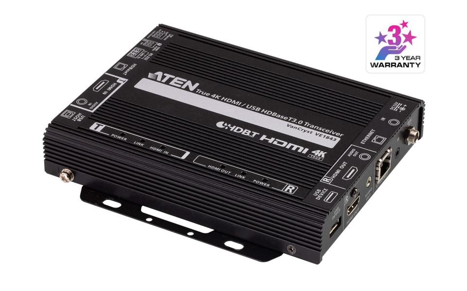 Dizajniran s HDBaseT 3.0 tehnologijom, VE1843 ne samo da proširuje True 4K nekomprimirane signale do 100 m preko jednog Cat 6a kabela (HDBaseT 3 Certified Cat 6a U/FTP kabel* / ATEN 2L-2920 Cat 6a kabel) s nultom latencijom, već također prenosi IR, RS-232, Ethernet, nezavisni audio i USB signale s najnovijim HDBaseT standardima. Za stabilan prijenos HDMI signala, VE1843 osigurava visokokvalitetnu sliku i pouzdano produljenje podržavajući HDCP 2.3, 3D, Deep Color, HDR, HDR 10+ i Dolby Vision. Dodatno, VE1843 je opremljen funkcijama HDMI audio ugradnje/de-embedding, što korisnicima omogućuje fleksibilnu prilagodbu odgovarajućih audio/video kombinacija na temelju različitih okruženja. Kako bi se osigurao rad bez prekida, dizajn hladnjaka s rebrima bez ventilatora sprječava pregrijavanje i time podiže njegovu pouzdanost.