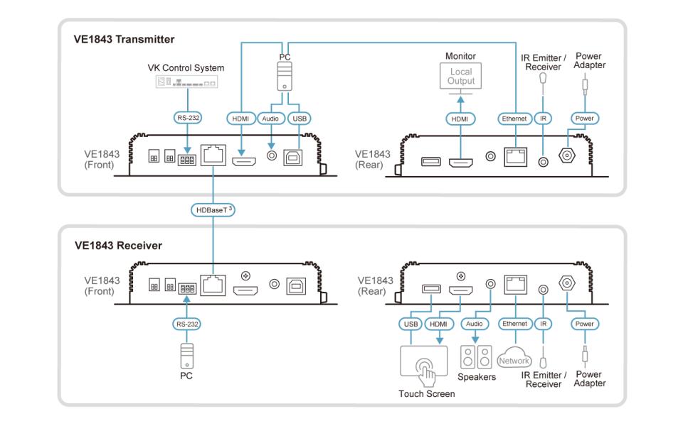 VE1843 je ATEN-ov prvi video primopredajnik i integrira funkcije odašiljača i prijemnika u jednu jedinicu. Ova kombinacija omogućuje korisnicima da jednostavno konfiguriraju jedinicu da bude odašiljač ili prijemnik ovisno o njihovom AV rješenju, te da uživaju u fleksibilnijoj implementaciji i učinkovitoj upotrebi s video matričnim prekidačima, video razdjelnicima itd.