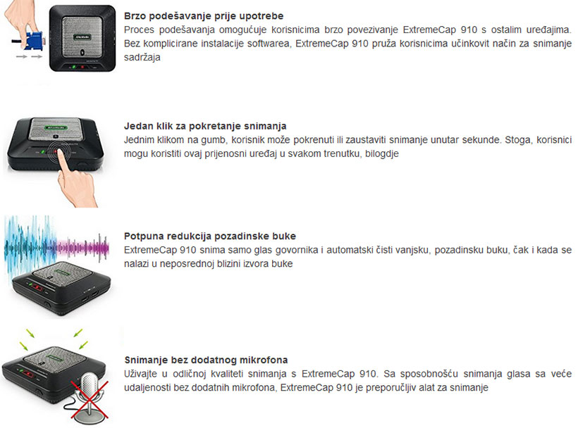 Za jednostavnije i kvalitetnije snimanje glasa, ExtremeCap 910 ima ugrađen visokokvalitetan mikrofon, koji snima isključivo glas govornika i sugovornika, te automatski čisti pozadinsku buku, kako bi snimke bile kristalno čiste i jasne za ponovnu reprodukciju, kada god to poželite.
