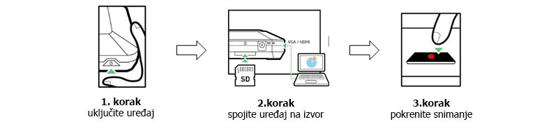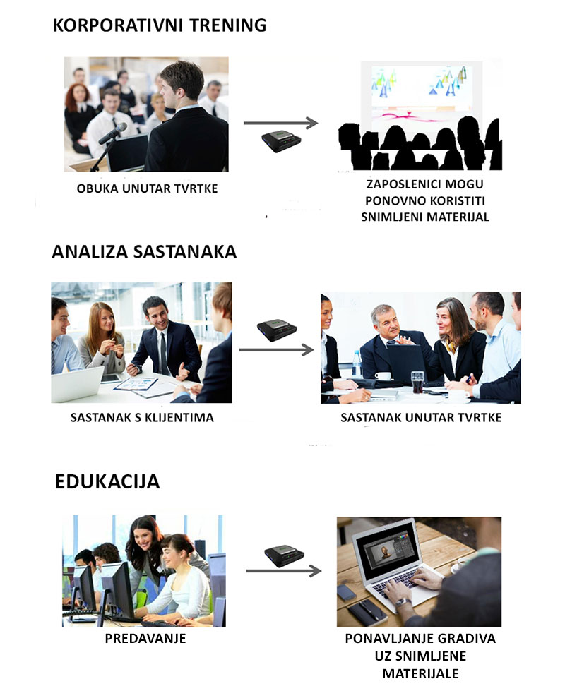 Jednostavnim povezivanjem uređaja na izvor medija, bez ikakve instalacije, korisnici mogu snimati samo glasovni (audio) sadržaj, ali i sadržaj koji se prikazuje na zaslonu (video), poput prezentacija, video predavanja, videokonferencijskih sastanka i dr.  Sadržaj se snima izravno na SD ili SDHC karticu, što je izrazito praktično za ponovnu reprodukciju - jednostavno umetnite karticu sa snimljenim sadržajem u računalo ili drugi uređaj i ponovno reproducirajte sve što ste snimili. Također, snimljeni sadržaj možete podijeliti ili postaviti na internet, primjerice Youtube.
