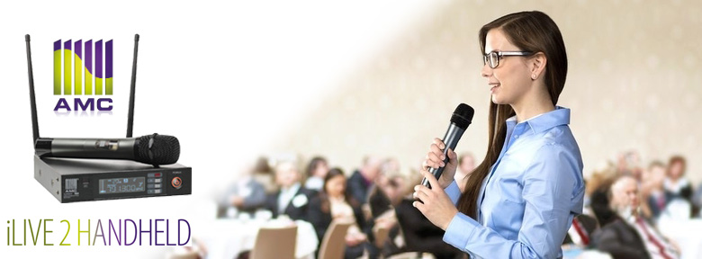 Bežični sustav mikrofona AMC iLive 2 Handheld, bežićni mikrofonski prijemnik, ručni mikrofonski predajnik i 6.3 mm kabel, mogućnost odabira do 32 kanala. Zahvaljujući naprednom PCB dizajnu i dinamičkoj cardioid mikrofonskoj kapsuli namijenjen je za konferencijske dvorane te pozornice.
