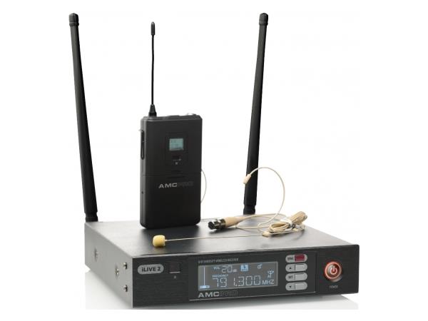 Bežični sustav mikrofona AMC iLive 2 Headset, bežićni mikrofonski prijemnik, naglavni kondenzatorski mikrofon, mikrofonski predajnik i 6.3 mm kabel. Namijenjen za konferencijske dvorane te pozornice. Mogućnost odabira do 32 kanala.