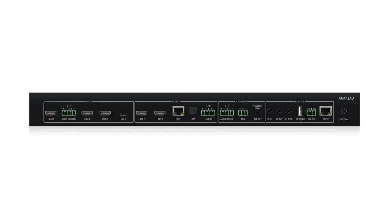 Naš AMF42AU napredni je 4K 4x2 HDMI 2.0 4K 60Hz 4: 4: 4 HDCP 2.2 multi-format preklopnik prezentacija koji sadrži 3 x HDMI 2.0 i 1 x USB-C ulaz na 2 x HDMI 2.0 / 1x HDBaseT ™ izlaza. AMF42AU pruža poboljšane značajke, uključujući neometano prebacivanje, neovisno skaliranje video zapisa na izlazima, MIC ulaz s audio miješanjem i 48V fantomskim napajanjem, PoC za napajanje Blustream kompatibilnog HDBaseT ™ prijamnika. AMF42AU također sadrži web GUI za kontrolu i konfiguraciju, kontrolu izvora i prikaza putem CEC-a, RS-232 i IR, ručni ili automatizirani odabir izvora, IR prolaz i kontrolu preko prednje ploče, IR, RS-232 i TCP / IP.