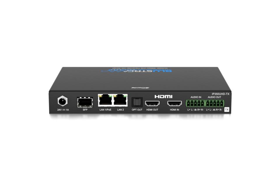 Multicast distribucijska platforma serije Blustream IP300 omogućuje distribuciju 4K HDMI videa gotovo bez kašnjenja (1 okvir) preko upravljane mreže od 1 Gb. Uz potpunu interoperabilnost s linijom proizvoda IP300UHD, IP350UHD-RX je vodeći u industriji 4K HDCP 2.2 HDMI prijemnik s omogućenim Danteom koji, koristeći tehnologiju vizualne kompresije bez gubitaka, isporučuje 18 Gbps HDMI, Dante & AES67 audio, dvosmjerni IR, RS-232 & USB/KVM do duljine od 100 m preko standardne bakrene mrežne arhitekture ili veće udaljenosti korištenjem ugrađenog optičkog SFP mrežnog sučelja. IP350UHD-RX može podržati i video i Dante audio distribuciju iz jedne mreže. Druga RJ45 veza omogućuje da se Dante audio mrežno sučelje odvoji od video preko IP mreže ako je potrebno. S integriranim skupom čipova za skaliranje HDMI od 18 Gbps, HDMI izlaz se može prilagoditi nižim razlučivostima gdje su naslijeđeni zasloni potrebni u istom sustavu kao i puni 4K. Mogućnosti skaliranja ove jedinice također omogućuju stvaranje videozidova gdje je to potrebno. Jedinica se može napajati putem PoE s mrežnog preklopnika ili lokalno preklopnik ne bi trebao podržavati PoE. S višestrukim dostupnim opcijama konfiguracije, fleksibilnost Blustream Multicast video over IP rješenja čini ovu platformu idealnom za više vrsta instalacije.