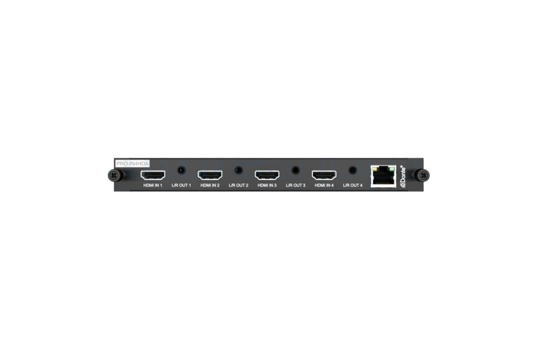 PRO-IN4HDA ploča ima 4x HDMI 2.0 ulaza koji podržavaju 4K 60Hz 4:4:4 koji se mogu neovisno usmjeriti na bilo koju HDMI/HDBaseT izlaznu ploču. Svaki HDMI ulaz uključuje neovisni 2-kanalni Dante audio izlaz, 2-kanalni analogni audio izlaz fiksne razine i 4x 2-kanalna Dante audio ulaza koji omogućuju ugrađivanje zvuka na HDMI izvor. PRO-IN4HDA ima priključke modula kartice za brzo otpuštanje koji omogućuju jednostavnu instalaciju u čvorište Custom Pro Matrix.