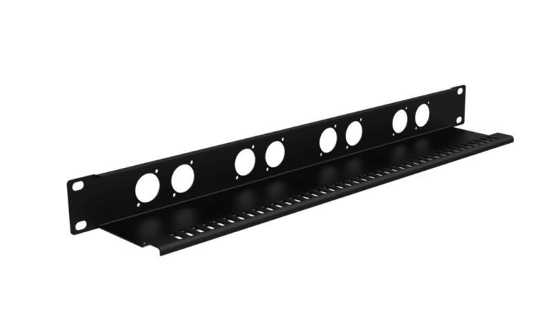 The BP108T is a 19'' blind panel with 8 D-size holes and tension relief, made of steel with a plate thickness of 1.5 mm and provided with a black (RAL9004) structured powder coating. The blind panel is used to build in D-size connectors which will make connecting in and outputs easier.