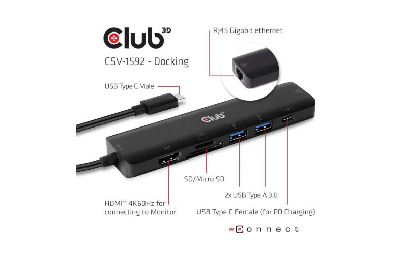 CSV-1592 - The Club 3D Hub is a USB Type C 7-in-1 Hub to HDMI™ 4K60Hz /SD-TF Card slot / 2x USB Type A / USB Type C PD / RJ45, providing an ideal solution for extending the port of USB Type C or Thunderbolt™ 3 host (PC/Laptop/tablet/Mobile phone, etc.),especially for the host with a single USB Type C port. This hub adopts the latest DP 1.4 Alt mode technology available today, enabling to output HDMI™ video with max 4k/60Hz and at the meanwhile transfer USB 3.1 data with max 5Gbps. 2x USB Type A ports allow you to connect 2 USB devices simultaneously.