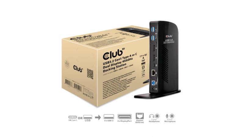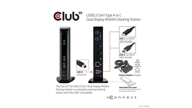 Club 3D CSV-1460 USB3.2 Gen1 Tip A ili C Dual Display 4K 60Hz Docking Station je dizajniran da zadovolji sve vaše zahtjeve povezivanja. Omogućuje ne manje od 6 USB3.2 Gen1 priključaka, vezu za slušalice i mikrofon, Gigabit Ethernet priključak i 2 x Displayport™4K60Hz izlaza. Potpuno je kompatibilan s USB C i USB3.2 Gen1 tip C na USB3.2 Gen1 tip B kabel uključen je u kutiju.