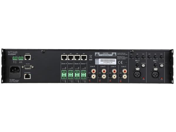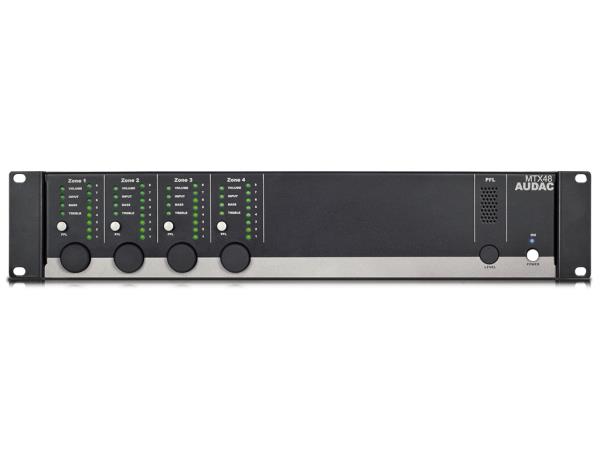 Audac MTX48, digitalna audio matrica za 4 zone. Posjeduje dva balansirana mikrofonska ulaza sa funkcijom prioritetnosti, Phantom napajanjem i 3-band kontroler tona, četiri stereo linijska ulaza za povezivanje na izvore signala poput: CD / MP3 player-a i tunera, te dva dodatna ulaza za povezivanje sa zidnim panelom (za linijske te mikrofonske signale).