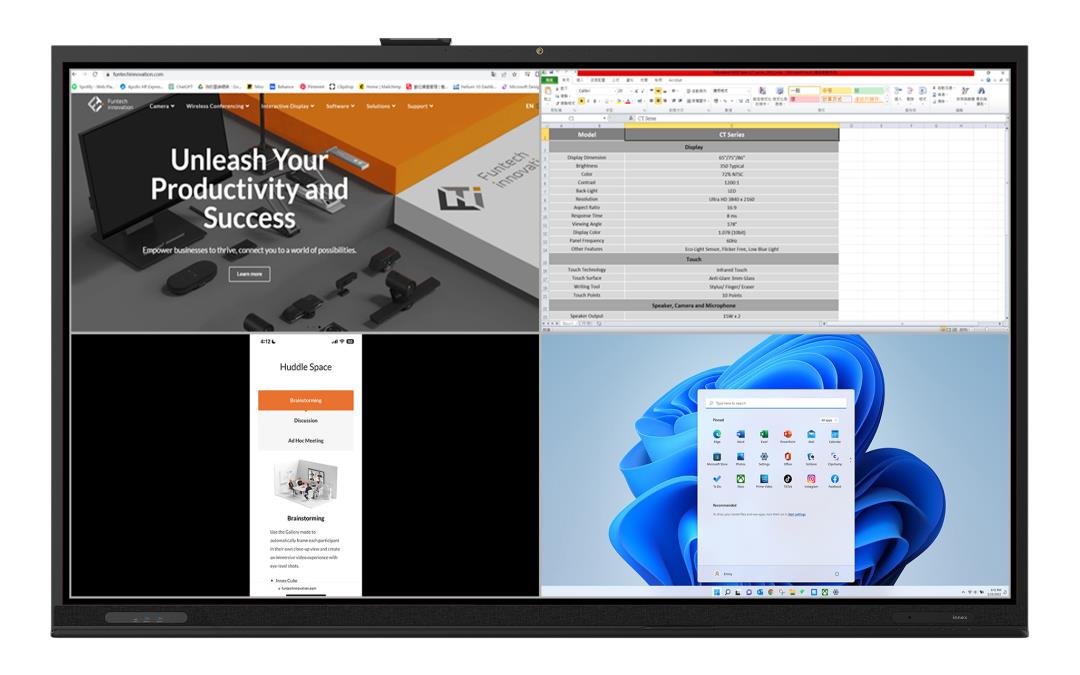 Serija CT može istovremeno povezati i prikazati do četiri uređaja, uključujući prijenosna računala, tablete i pametne telefone, na četverostruko podijeljenom zaslonu, omogućujući članovima tima da surađuju i zajedno razmišljaju. Upotrijebite gumb plug-and-play Connect Pro za dijeljenje zaslona jednim klikom. Pristupite kameri bežično izravno s prijenosnog računala.