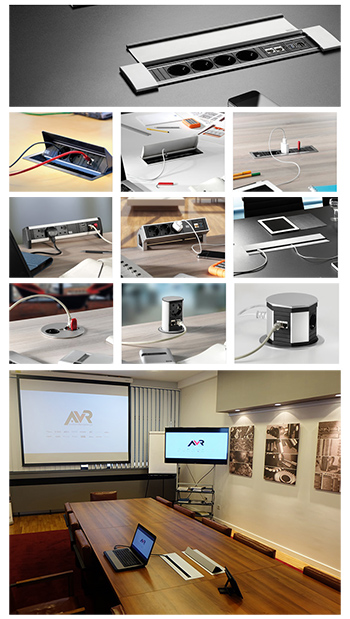 Kako bi Vaša prezentacijska dvorana ili soba za sastanke bila što praktičnija, a pritom izgledala što reprezentativnije, u našoj ponudi možete pronaći različite tipove audio-video konekcijskih pločica. Od VGA priključnih panela, HDMI priključnih panela, audio panela i ostale slične opreme namijenjene spajanju Vaših računala ili ostale AV opreme na projektore ili LCD ekrane. Moduli, tj priključni paneli mogu biti nadžbukni, podžbukni, podni ili montirani u vrhunske aluminijske lakirane stolne kutije u srebrnoj ili crnoj varijanti.