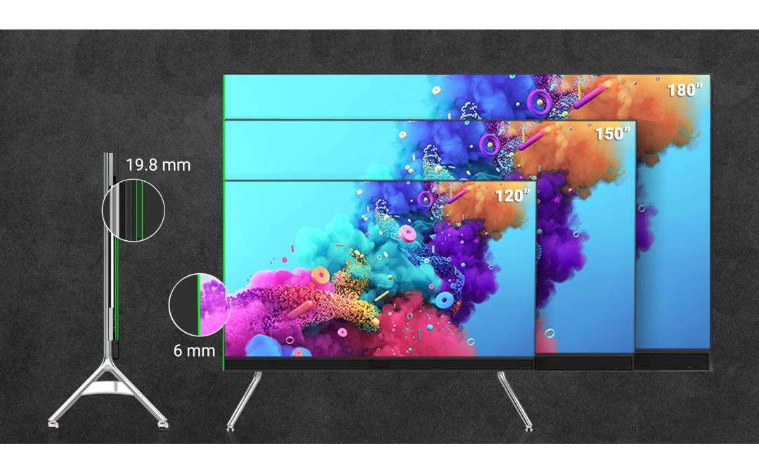 Dostupan u veličinama od 120”, 150” i 180” kako bi pružio vrhunsko iskustvo gledanja velikih razmjera, serija Newline DV donosi lagani dizajn s elegantnim zaslonom bez okvira s kućištem od 19,8 mm postavljenim na ultratanki okvir od 6 mm .
