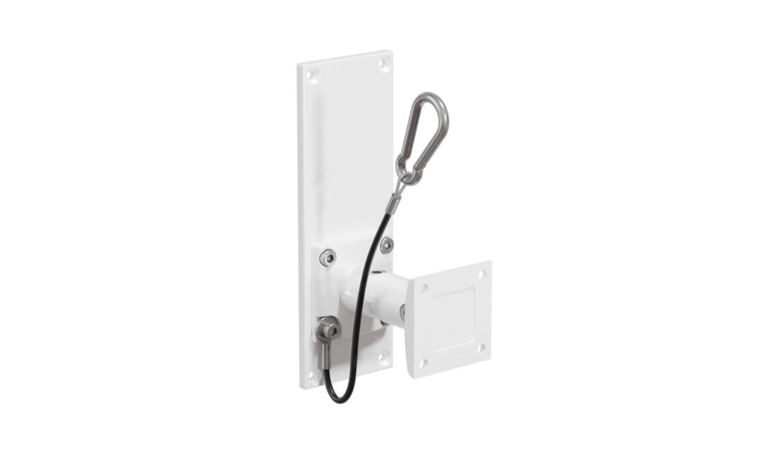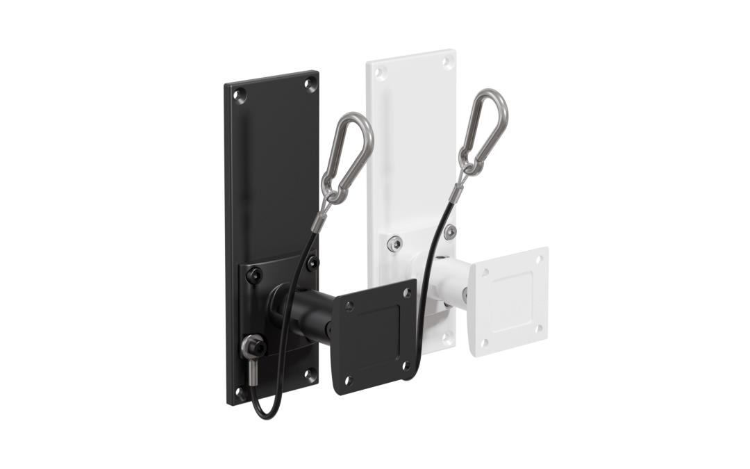 Dvosmjerni okretni nosač, koji omogućuje instalaciju zvučnika na svakom mjestu i fokusiranje u željenom smjeru. Pomoću ovog nosača zvučnik možete montirati vodoravno i okomito. Vertikalna metoda postavljanja pruža dodatnu prednost kada je visina postavljanja na zid ili strop ograničena usmjeravanjem zvučnika izravnije prema dolje. Dvosmjerni okretni nosač izrađen je od izuzetno čvrstog materijala od legure cinka koji osigurava čvrstu i sigurnu montažu zvučnika. Jedna vodoravna i jedna okomita okretna točka osiguravaju jednostavno fokusiranje zvučnika u bilo kojem smjeru. Za postizanje optimalne instalacije, raspodjele sila na okretnim točkama i slobode u fokusiranju zvučnika, preporuča se postaviti zakretne točke zvučnika na način da je okretna točka na zidnoj ploči postavljena u vodoravnom smjeru . Okretna točka na ploči zvučnika postavljena je u okomitom smjeru. Ploča zvučnika mora se pričvrstiti na kućište zvučnika umetanjem 4 isporučena vijka za pričvršćivanje u prethodno izbušene rupe s navojem na stražnjoj strani kućišta zvučnika. Zidna ploča mora biti pričvršćena na zid pomoću četiri vijka. Korišteni spojni elementi ovise o montažnoj površini (cigla, beton, drvo, ...).