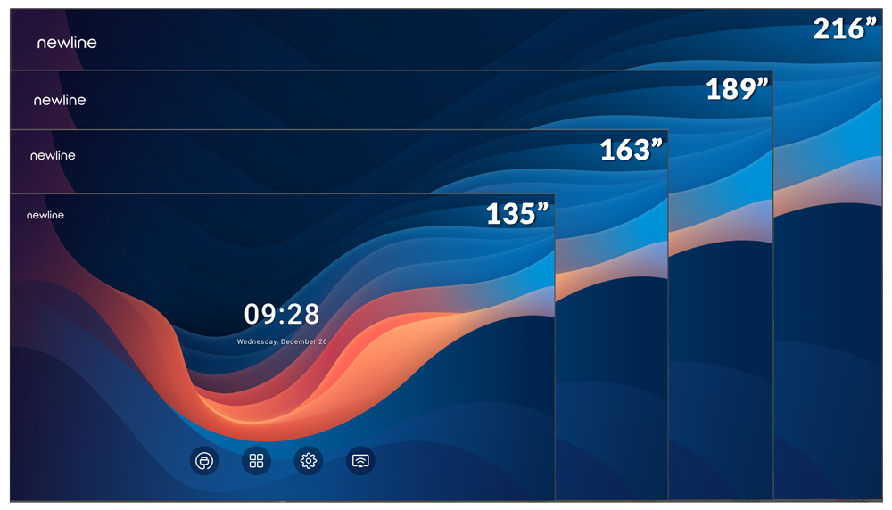 DV One+ LED zasloni dostupni su u četiri veličine – 135", 163", 189" i 216", što omogućuje veliku fleksibilnost u primjeni i prilagodbu različitim prostorima, od manjih prostora do velikih auditorija i konferencijskih dvorana.