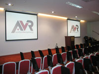 Postavljena su dva Optoma projektora u digitalnoj DLP tehnologiji snage 4000 ANSI lumena. Radi lakšeg održavanja projektori su 'filter free' dizajna sa mogućnošću izmjene lampe bez skidanja projektora sa stropnog nosača. Korištena su Grandview motorna projekcijska platna širine 250cm sa crnim rubom kako bi se dodatno naglasila projicirana slika. Na platnima je moguće prikazati istu ili različitu sliku (DVD/kamera/računalo) za potrebe videokonferencija. Moguće je snimiti prezentaciju i govornika (sliku i ton) te je po završetku ponuditi dokumentiranu na DVD mediju. Ozvučenje je izvedeno sa multizonskim pojačalo kako bi se dvorana mogla po potrebi razdijeliti na manje cjeline kod kojih bi svaki imao zaseban zvuk. U funkciji je 4 bežićnih ručnih mikrofona u kombinaciji sa 2 bubice te bežićni presenter kako bi se osigurala mobilnost govornika.