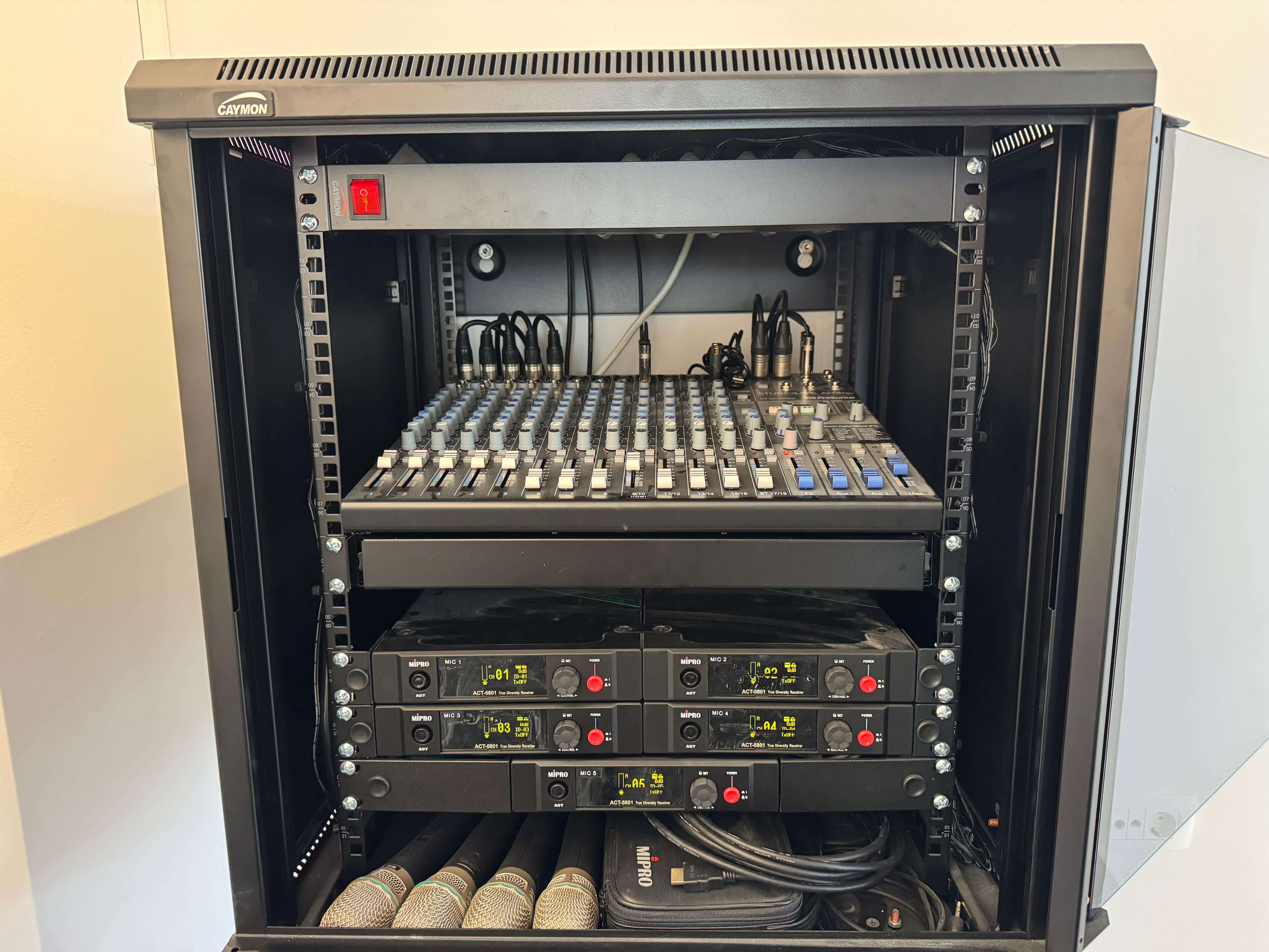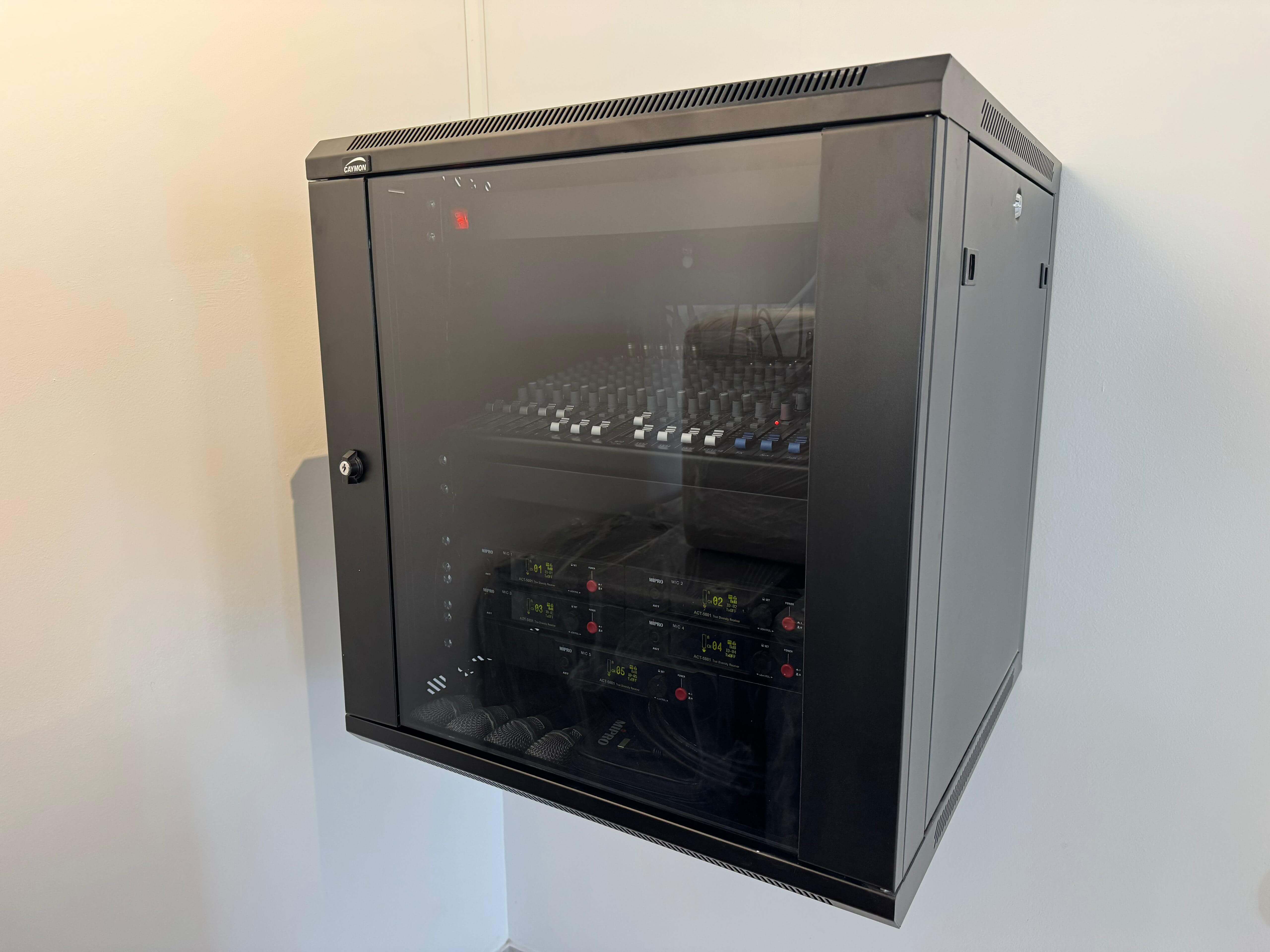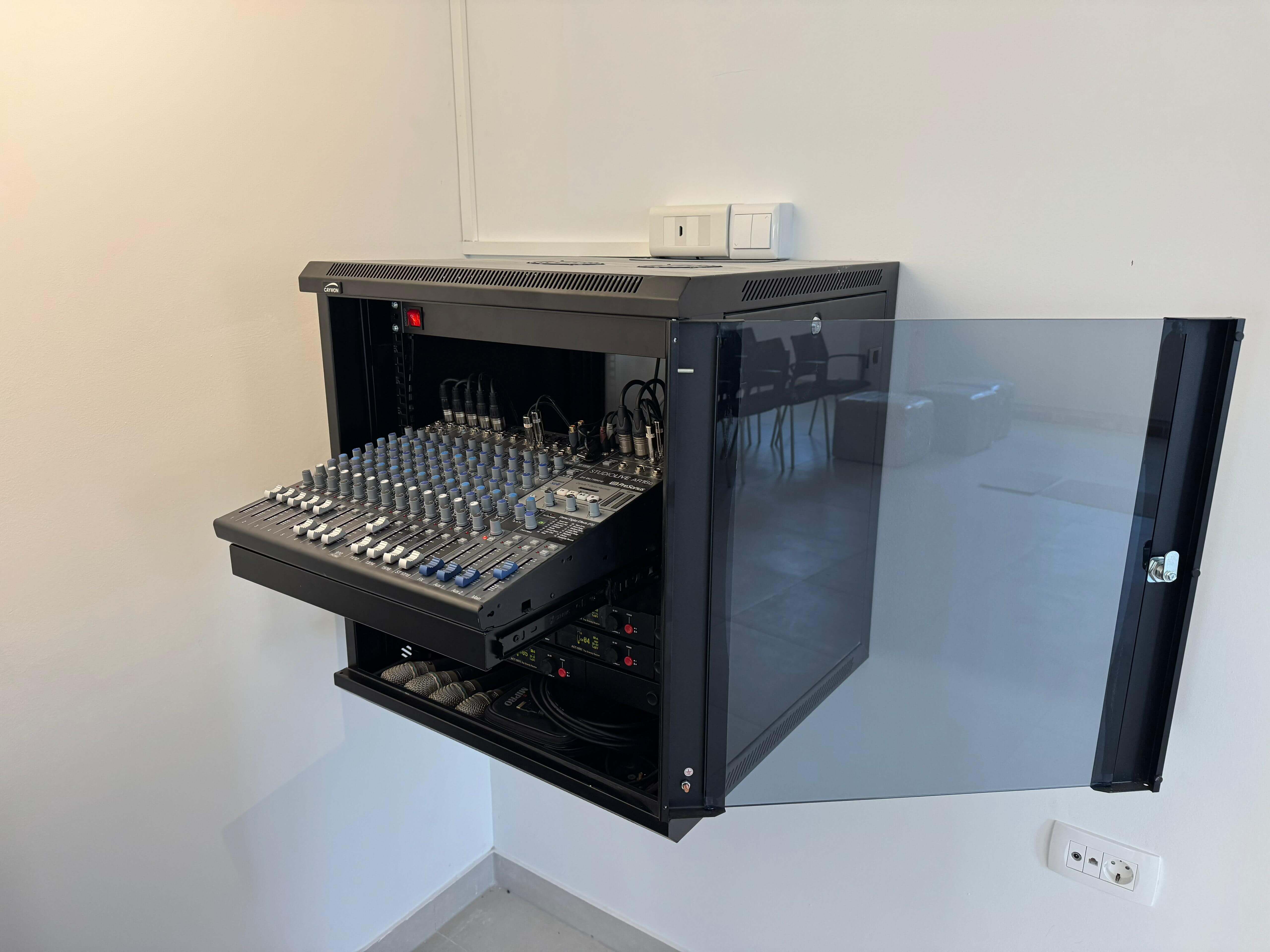 Oprema je smještena u zidni rack ormar, iz kojeg se jednostavno upravlja svim uređajima. Sve je spremno za predstavu ili nastup u roku od dvije minute.