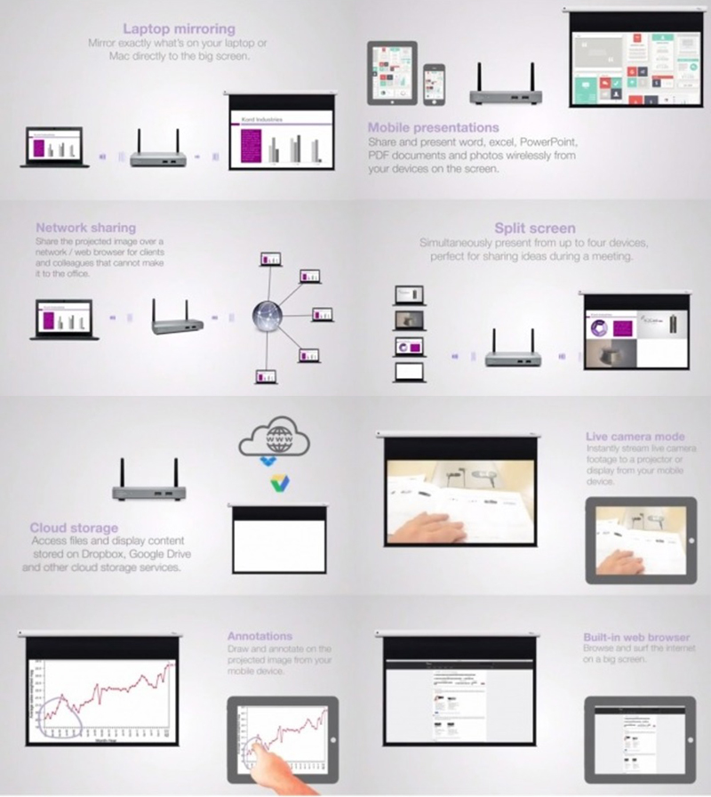 Zgrabite pozornost zahvaljujući opciji crtanja i bilježenja na slikama projiciranim s vašeg mobilnih uređaja. Također nudi istovremeni prikaz sadržaja sa 4 različita uređaja na velikom ekranu.