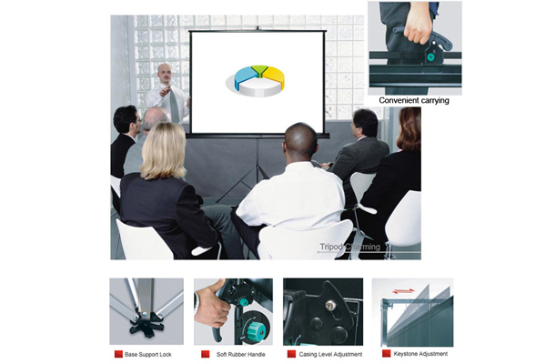 Dodatni crni bočni rub za postizanje većeg kontrasta između projicirane slike i okoline. Mala težina radi lakšeg prenošenja sa metalnom izdržljivom ručkom.