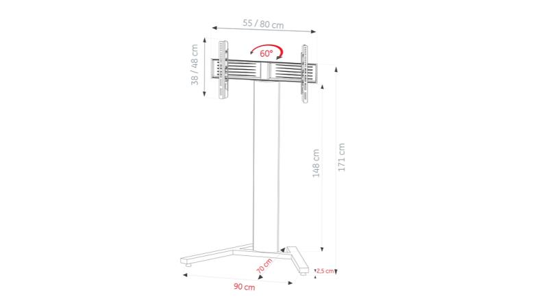 Podni stalak za ekrane veličine od 32-55 inča. VESA standard do 600x400. Dolazi u kompletu sa kotačićima. Visina aluminijske šipke (stalka) je 150 cm, Nosivost stalka do 25 kg, te opcija zaokretanja za 60 stupnjeva.