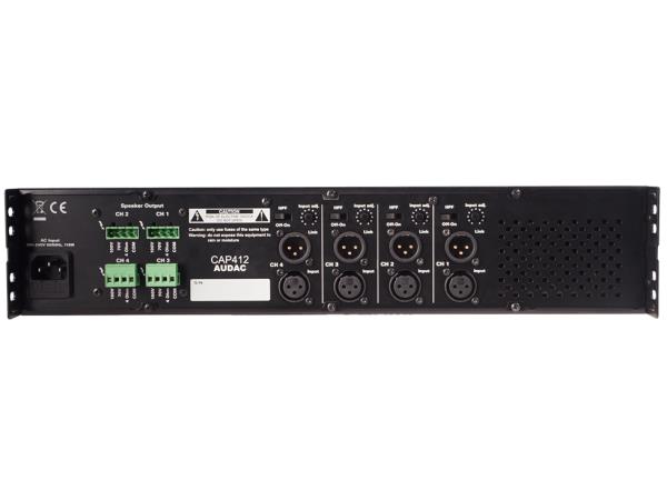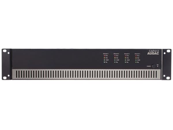 Pojačalo Audac CAP412, profesionalno pojačalo sa 4 odvojena kanala, sa snagom od 120 W po kanalu. Pruža veliku fleksibilnost, te nove mogućnosti za multi-zonski audio sistem. Vrlo "user-friendly", te jednostavan za instalaciju. Svaki kanal pojačala nudi različite načine rada koje uključuju 100V, 70V i 4 Ohm-a način rada. Pojačalo na svojoj stražnjoj strani kućišta ima Gain potenciometar, te high-pass filter (400Hz). Dolazi sa ugrađenim zaštitnim krugom koji štiti pojačalo od DC kvara, kratkog spoja, preopterećenja i pregrijavanja, a ograničava i signal ukoliko je potrebno.