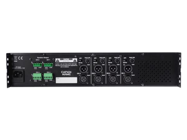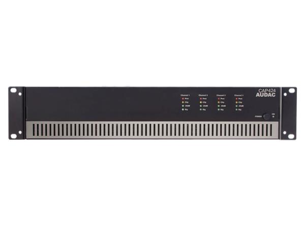 Pojačalo Audac CAP424, profesionalno pojačalo sa 4 kanala, sa snagom od 240 W po kanalu. Fleksibilno rješenje za multi-zonski audio sistem sa 4 zone. Vrlo "user-friendly", te jednostavan za instalaciju.Visoka učinkovitost, te pouzdanost, zahvaljujući kombinaciji switch napajanja i pojačala D klase. Dolazi sa ugrađenim zaštitnim krugom koji štiti pojačalo od DC kvara, kratkog spoja, preopterećenja i pregrijavanja, a ograničava i signal ukoliko je potrebno. Pojačalo na svojoj stražnjoj strani kućišta ima Gain potenciometar, te high-pass filter (400Hz).