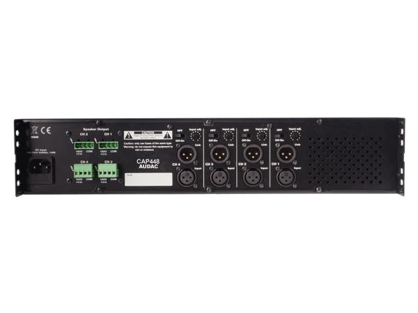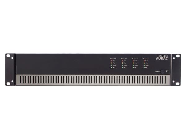Pojačalo Audac CAP448, profesionalno pojačalo sa 4 kanala, sa snagom od 480 W po kanalu. Fleksibilno rješenje za multi-zonski audio sistem sa 4 zone. Vrlo "user-friendly", te jednostavan za instalaciju. Visoka učinkovitost, te pouzdanost, zahvaljujući kombinaciji switch napajanja i pojačala D klase. Dolazi sa ugrađenim zaštitnim krugom koji štiti pojačalo od DC kvara, kratkog spoja, preopterećenja i pregrijavanja, a ograničava i signal ukoliko je potrebno. Pojačalo na svojoj stražnjoj strani kućišta ima Gain potenciometar, te high-pass filter (400Hz).