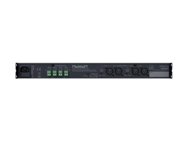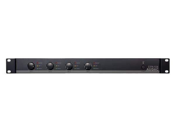 Pojačalo Audac EPA104, 4 kanalno stereo pojačalo, opcija korištenja 2 neovisna stereo kanala. Radi u D klasi, za izvrsnu učinkovitost, te izvanrednu kvalitetu zvuka. A lagano i kompaktno kućište ga čini idealnim kako za fiksne tako i mobilne aplikacije. U kombinaciji sa integriranom aktivnom skretnicom nudi kompletno rješenje za kompaktne stereo aplikacije sa Subwoofer-om. Energetski učinkovito pojačalo; kada audio signali nisu detektiran,i pojačalo se automatski prebacuje u standby način rada, prilikom čega je potrošnja energije manja od 1W. 4 x 100 W (4 Ohm), 4 x 50 W (8 Ohm).