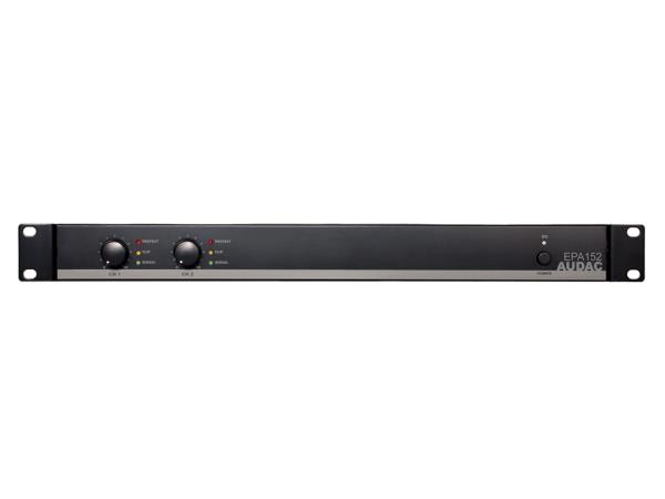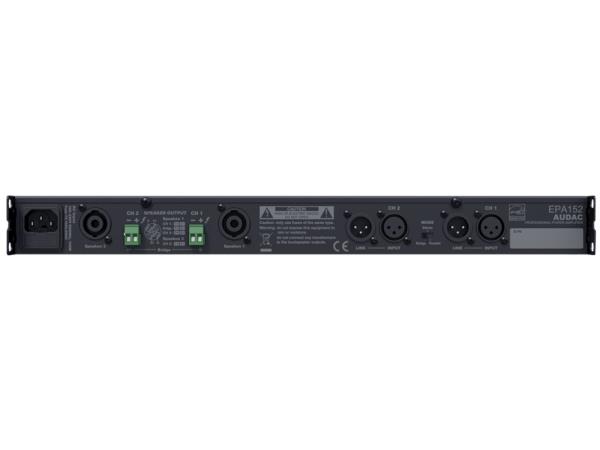 Pojačalo Audac EPA152, 2 kanalno stereo pojačalo. Radi u D klasi, za izvrsnu učinkovitost, te izvanrednu kvalitetu zvuka. A lagano i kompaktno kućište ga čini idealnim kako za fiksne tako i mobilne aplikacije. Energetski učinkovito pojačalo; kada audio signali nisu detektirani, pojačalo se automatski prebacuje u standby način rada prilikom čega je potrošnja energije manja od 1W. 2 x 150 W (4 Ohm), 2 x 80 W (8 Ohm).