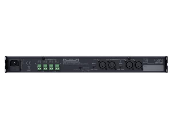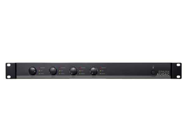 Audac EPA254, 4 kanalno stereo pojačalo, opcija korištenja 2 neovisna stereo kanala. Radi u D klasi, za izvrsnu učinkovitost, te izvanrednu kvalitetu zvuka. A lagano i kompaktno kućište ga čini idealnim kako za fiksne tako i mobilne aplikacije. U kombinaciji sa integriranom aktivnom skretnicom nudi kompletno rješenje za kompaktne stereo aplikacije sa Subwoofer-om. Energetski učinkovito pojačalo; kada audio signali nisu detektirani, pojačalo se automatski prebacuje u standby način rada prilikom čega je potrošnja energije manja od 1W. 4 x 130 W (8 Ohm), 4 x 250 W (4 Ohm).
