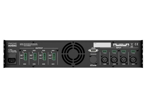 The PMQ series are professional 100V quad channel power amplifiers, providing a new standard for premium sound 100V amplification in public address applications. Their advanced features and availability in different output powers provide an enormous flexibility for numerous applications.The PMQ240 is a four channel Class-D 100V power amplifier with an output power of 240 Watt for each channel. The WaveDynamics™ DSP processor combination with the 2.5” LCD display gives an unmatched user experience with intuitive functions overview for easy configuration. Acoustics can be optimized using the filters selectable between Low / High & Band Pass and the 7-Band equalizer both with adjustable frequencies and Q-factor. Other provided functions are delay and dynamic bass boost. These settings can be custom configured using the front panel of the amplifier, whereby access can be given on two different levels (User & Administrator) using password or USB-key protection. Configuration is made simple by the loudspeaker presets and full system configurations which can be selected from a library and uploaded with a USB flash drive. This ensures the best acoustical performance with a ‘bullet-proof’ loudspeaker protection. A great input flexibility and source compatibility is offered by the input selection matrix and the XLR and terminal block signal connections. System integration is made easy using the RS-232 control port. Optional Dante™ interface is available for the WaveDynamics™ amplifiers. The installation of this network interface allows receiving and sending of low latency, high quality audio over a standard Ethernet network.