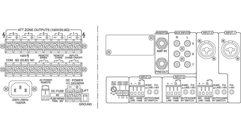 Ulazi 2.5 mV/2 kΩ (mic 1), 2.5 mV/2 kΩ, 0.3 V/200 kΩ (mic/line 2-4), 0.3 V/5 kΩ (line 5-7), 0.775 V/10 kΩ (pr