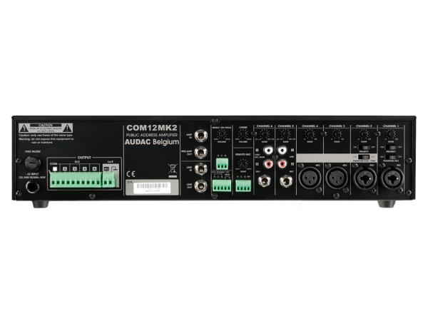 Audac COM12MK2, 5 zonsko pojačalo sa snagom od 120 W, te ugrađenim mixer-om sa četiri balansirana XLR ulaza i dva nebalansirana stereo RCA ulaza koji dolaze u kombinaciji sa mikrofonskim ulazom. Na prednjoj strani kućišta nalaze se regulatori glasnoće pojedinog kanala, regulator za glavnu glasnoću, te regulatori za podešavanje tona, odnosno bas tonova, te visokih tonova.100V ili 4 Ohm-a