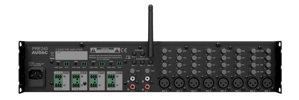The PRE240 series preamplifiers are solutions for applications where a large number (up to 8) of microphones (or other mono balanced audio inputs) need to be mixed to four output zones. The multifunctional stereo design with a total of 10 inputs allows connection for any type of audio source such as microphones, Bluetooth devices or line level audio sources. Channels one up to eight are balanced inputs, allowing the connection of microphones or line level audio sources with the ability of enabling 48V phantom power to each input. They feature 3-band tone control and talk-over for priority announcements. The other two (9 and 10) inputs are unbalanced stereo line inputs allowing connection of any type of line level audio source. An integrated Bluetooth receiver and a front panel 3.5mm jack offers convenient wired or wireless connection possibilities for mobile and portable devices including laptops, smartphones and tablets. The front panel includes a master volume control with 2-band tone control and LED VU bar for each output. Each input section is accommodated with input mixing dials and output selection switches. A priority mute for each zone output suppresses all (non-priority) music sources in case of contact closure, allowing linking autonomous alarm systems.