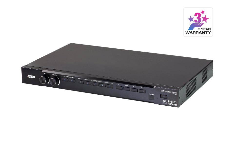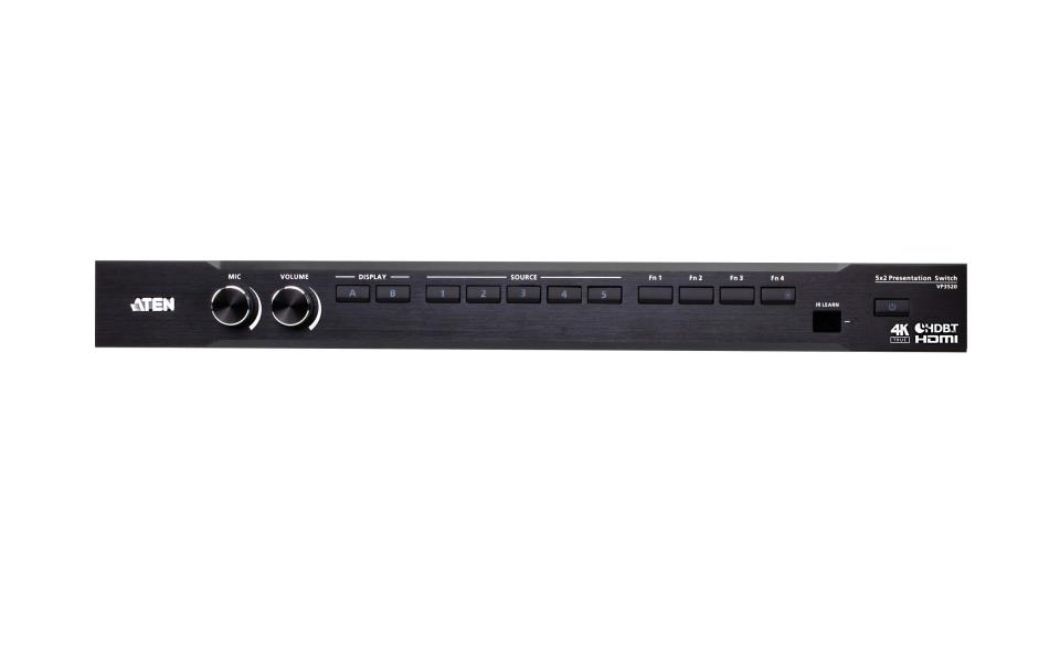 ATEN VP3520 is a multi-in-one presentation matrix switch that integrates a video matrix switch, 4K scaler, HDBaseT extender, and audio DSP functions into one compact device that easily mounts under a table or in a rack. The VP3520 seamless presentation matrix switch with control features the True 4K video resolutions of 4096 x 2160 / 3840 x 2160 @ 60 Hz (4:4:4) and HDR technology, guaranteeing crystal-clear images across two displays. The VP3520 supporting 4K @ 60 Hz, HDMI, and HDCP 2.2 features Seamless Switch™ that employs an FPGA matrix architecture that ensures continuous video streams, real-time control, and stable signal transmissions. With a built-in high-performance 4K scaler, the VP3520 easily converts various input resolutions into various output display resolutions, giving viewers the best video and picture quality across the two displays.