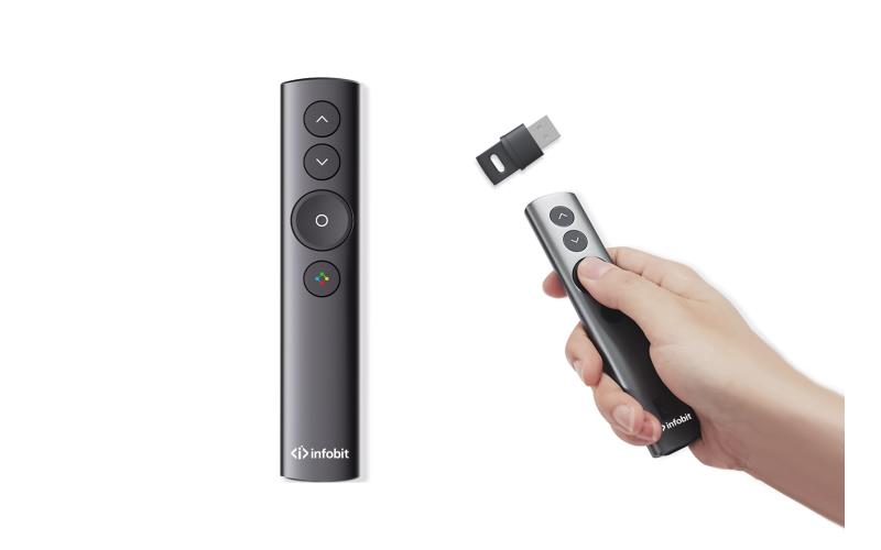 iMeeting PT21 Bluetooth presenter, udaljeno upravljanje prezentacijama sa četri tipke, ugrađene funkcije miš/laser/povećalo/spotlight/označavanje/brojač vremena, mogućnost promjene boje lasera, ugrađen 8Gb drive za pohranu podataka, podrška za dva monitora, kompatibilan sa macOS/Android/Windows, područje prijema do 30m.