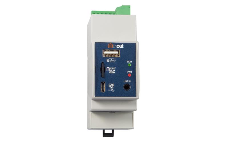 8 individually configurable logic ports, both as inputs (for sequential playback of audio files) for switches or touch-sensor, or as outputs for external relay activation;