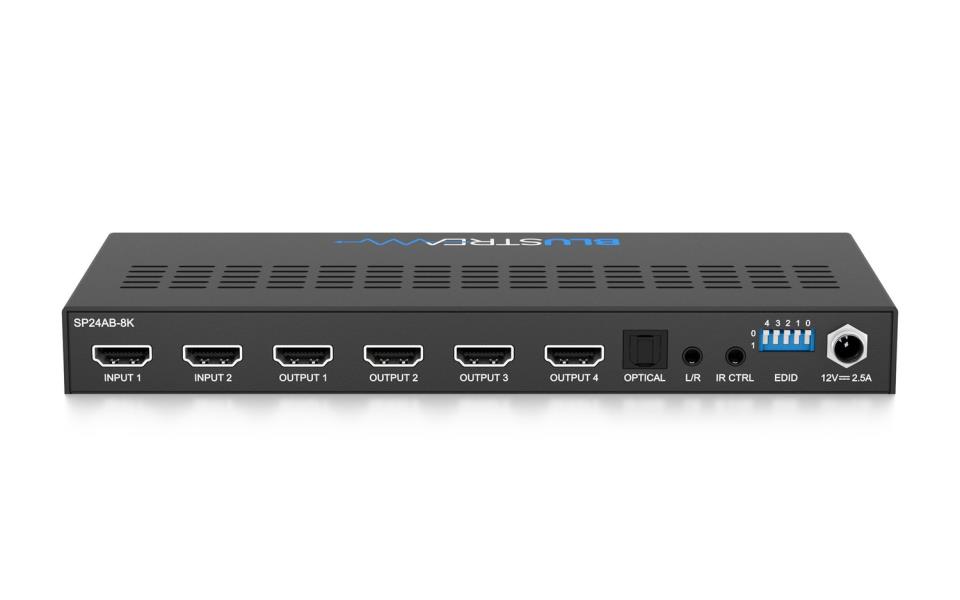 With selection of 2 x HDMI 2.1 input sources, a single source can be distributed to up to 4 x outputs simultaneously, the SP24AB-8K can auto-switch based on detecting a 5V hot plug, a new TMDS signal; or manually using IR or the front panel. Analogue and coaxial digital (S/PDIF) audio breakout allows for audio integration, HDCP2.3 compliant, and advanced EDID management.
