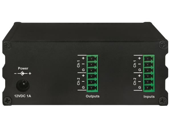 The rear of each model provides two or four analogue audio outputs on 3.5mm Euro connectors and a 12VDC external power supply connection. The external power supply is included, although it is also possible to power the device using PoE.