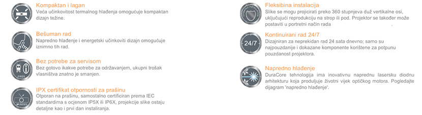 DuraCore laser precizno je projektiran s optičkim motorom koji je otporan na prašinu i posjeduje neovisno certificiran IP certifikat. To osigurava dugotrajan, pouzdan i bez održavanja izvor svjetlosti u full brightness načinu rada.