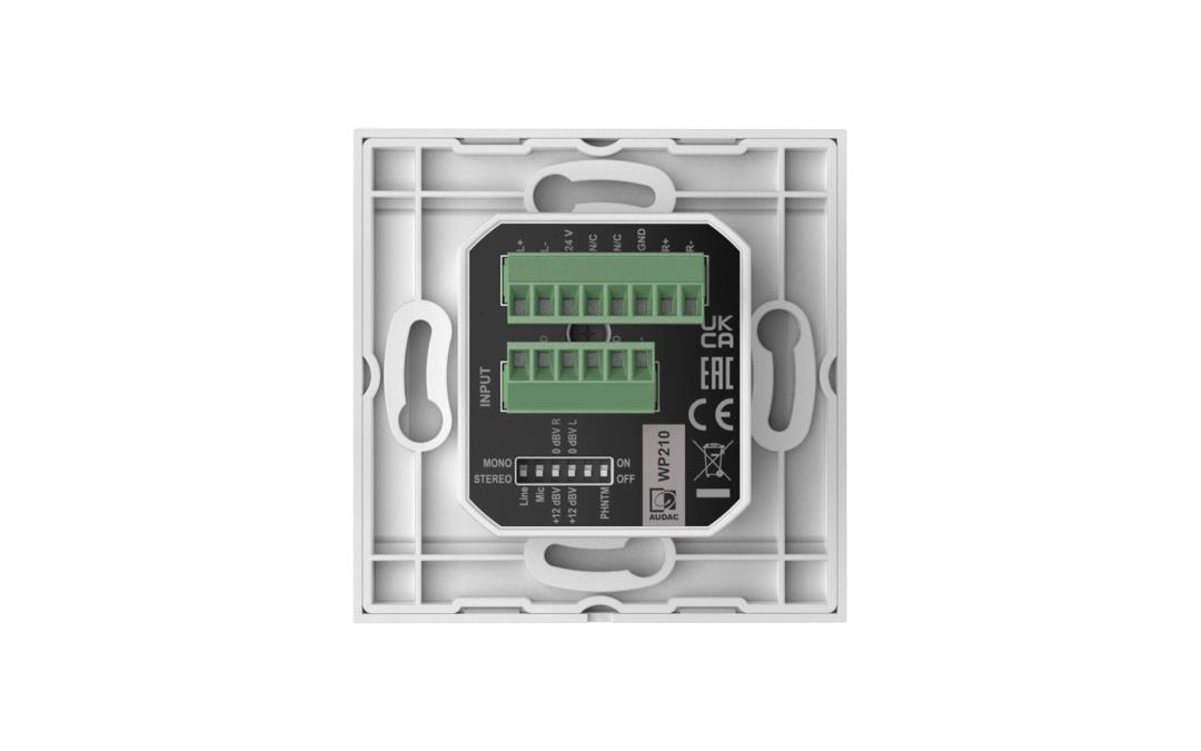 The WP210 is a remote wall mixer that can be used in combination with various AUDAC hardware (ARES5A, MTX series, AMP523 and more). It converts the signal coming from a stereo line-level audio source (such as a tuner, mobile devices, ... ) or balanced microphone to the level corresponding to the differential signal input making it possible to transfer high-quality audio over long distances between the wall panel and the loudspeaker, by just using inexpensive twisted-pair CAT5e or better cabling. On the front side of the wall panel, there is a 3.5 mm jack stereo line input connection available together with a balanced XLR microphone input, both provided with their own knob which allows the signals to be mixed together.