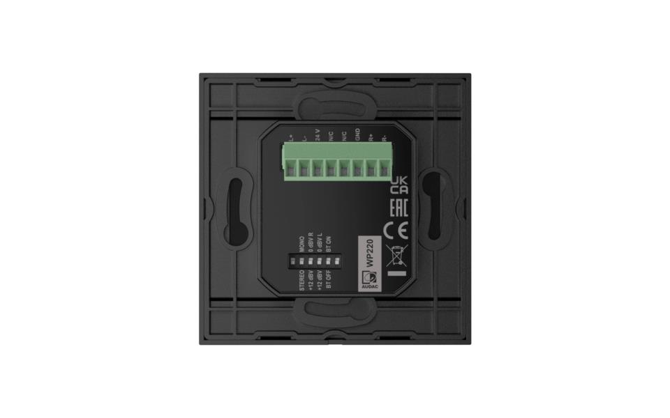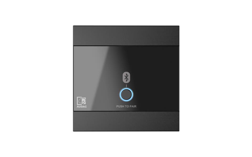 remote universal wall panel with Bluetooth receiver input that can be used in combination with various AUDAC hardware (ARES5A, MTX series, AMP523 and more). It was never easier connecting your Bluetooth enabled device with your audio installation using this wall plate.  It will enable you to transfer high-quality audio over long distances between the wall panel and the loudspeaker, by just using inexpensive twisted-pair CAT5e or better cabling.