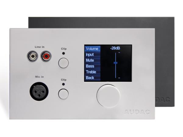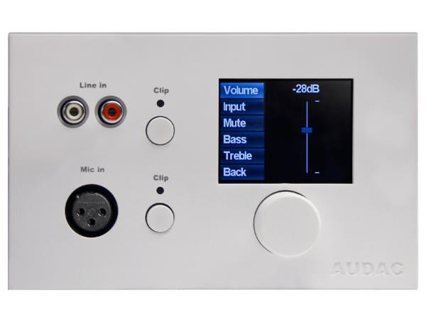 The MWX65 is an all-in-one wall panel controller to be used in combination with the AUDAC MTX series multi-zone audio matrix systems. It can control the input signal and volume for one zone and also contains an additional line and microphone level input which can be patched to the zone it is connected to. Both input selection and volume control as well as two band tone control can be controlled using the versatile rotatable push-dial while the integrated 2.5” graphical display ensures a user friendly experience. An XLR connector is provided as additional microphone input while the line input is performed using RCA connectors. The signals applied to these inputs can be used as one additional local input. This enables you to connect any CD or MP3 player as local music source or connect a microphone for speeches or other announcements. The input mixing can be done by using both push-lock potentiometers. The microphone input has the possibility to provide 15V phantom power which can be turned on and off by software configuration. The wiring between the matrix and the wall panel should be performed by using standard UTP CAT5 cabling which transfers both the control and audio signals to the matrix while providing the power supply for the wall panel.