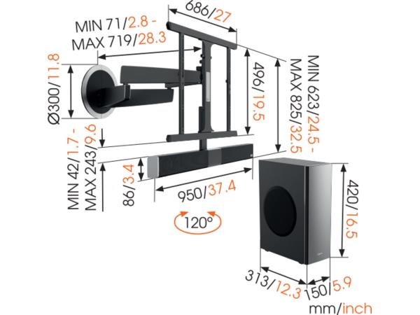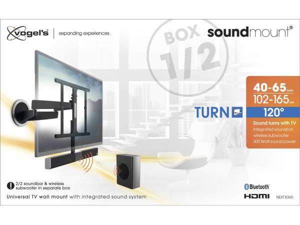 Zidni stalak Vogels Next 8365, TV uređaji postaju sve tanji i lakši, a to se najviše osjeća na kvaliteti zvuka. Zahvaljujući SoundMount nosaču, ovo više neće predstavljati problem jer ovaj TV nosač kombinira high-end zidnu rotaciju (Vogel's Design Mount) s ugrađenim soundbarom (uključuje i bežični subwoofer). Na ovaj način možete uživati u najboljoj slici i zvuku s bilo koje pozicije u prostoriji. Konstruiran za pružanje čvrste potpore televizorima sa težinom do 30 kg te veličinom zaslona od 40 - 65 inča. S iznimnom lakoćom se naginje za 20°.