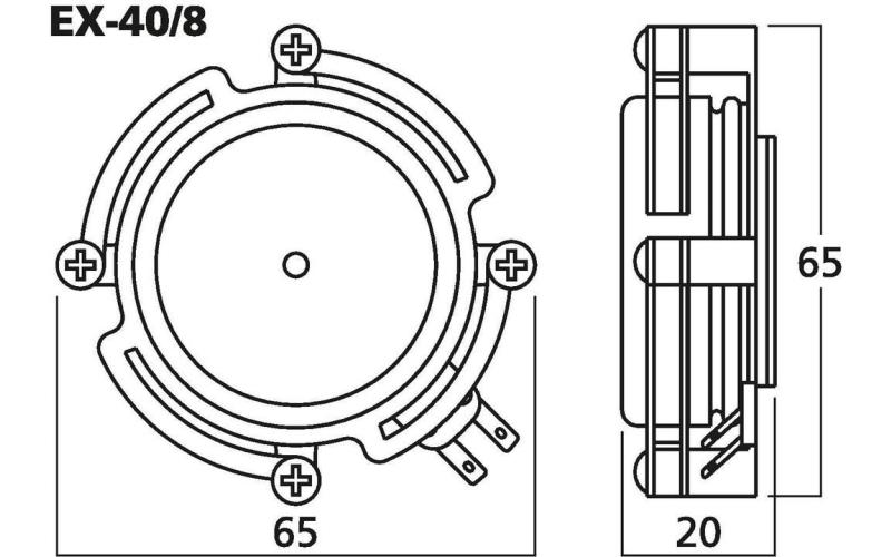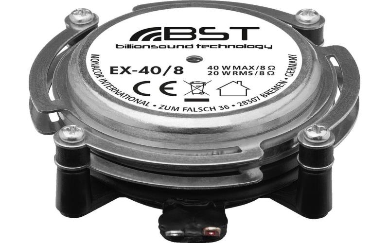 Exciters are suitable for music and voice reproductions via surfaces capable of vibrating. They are simply glued onto doors, cupboard doors, shelves, desktops, lightweight walls, ceiling panels or many other surfaces which are capable of vibrating. Vibration of these surfaces create an impressive sound in the entire surrounding area.
